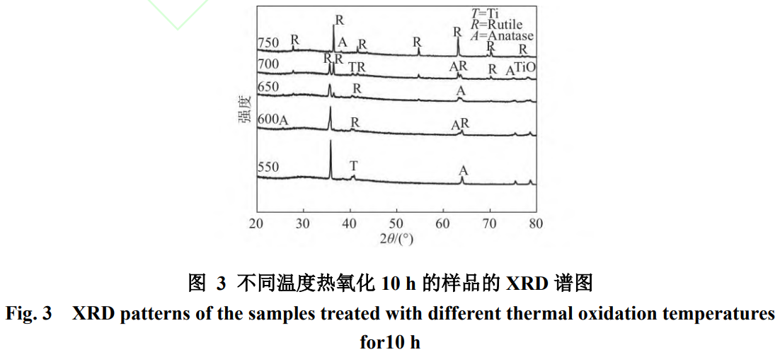 不同溫度熱氧化10h的樣品的XRD譜圖如圖3所示。從圖3中可以看出,經熱氧化后的樣品表面主要由Ti峰,銳鈦礦型TiO2和金紅石型TiO2以及氧擴散相TiO相組成。可以發現550℃時主要由銳鈦礦型和Ti峰組成,僅有少量的金紅石型,隨著溫度的升高,試樣中的銳鈦礦型向金紅石型轉化,并且Ti峰的強度開始降低,金紅石峰占據主導地位。