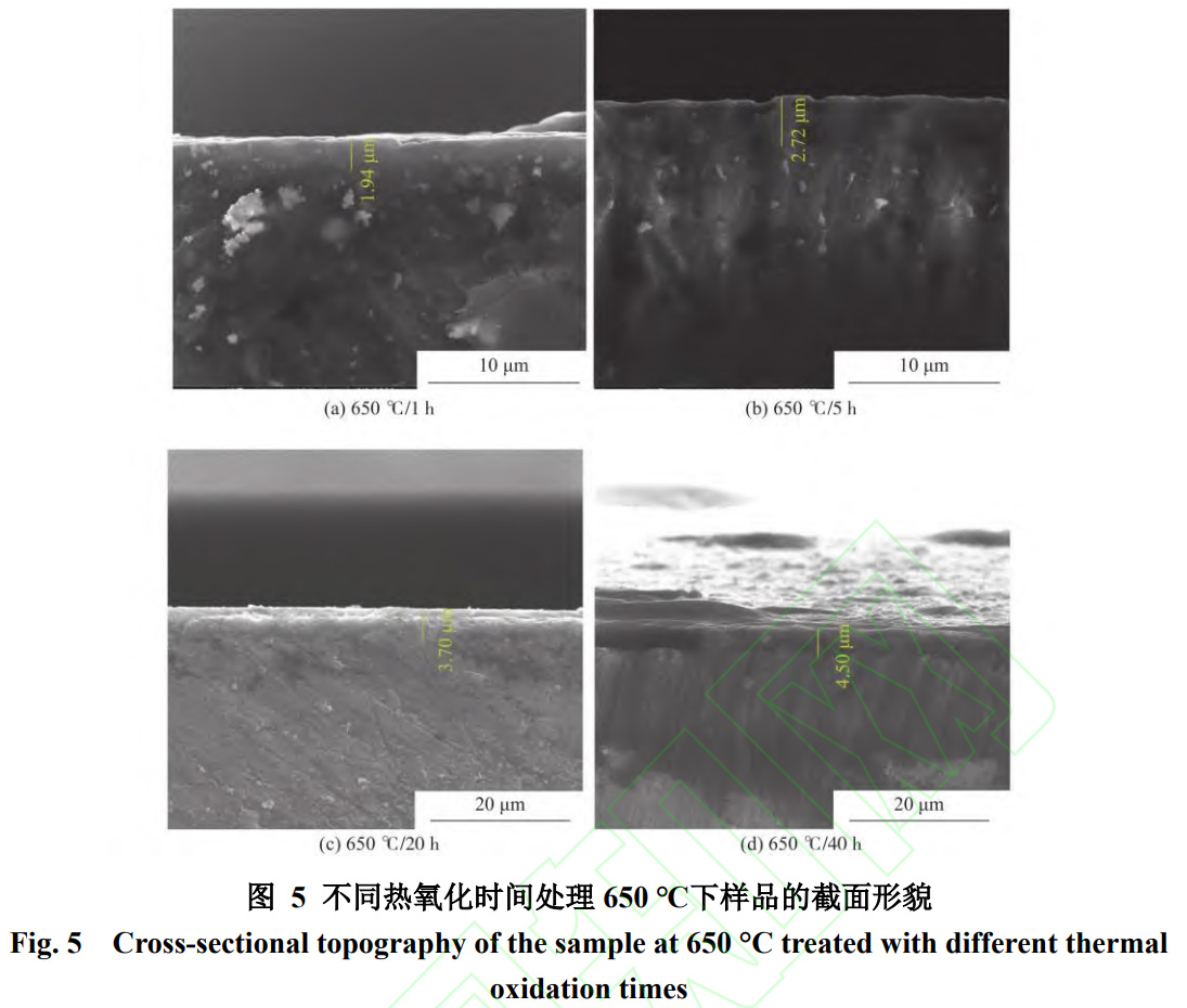 650℃下熱氧化不同時間的樣品表面的微觀形貌如圖4所示。從圖4中可以發現,熱氧化1h時樣品表面氧化顆粒較小且沒有完全覆蓋,5h時表面的氧化顆粒有所長大但沒有完全覆蓋,10h時如圖1(c)可以看到表面完全覆蓋氧化顆粒且比較致密。而時間達到20h時隨著氧化顆粒的繼續長大,表面的氧化顆粒之間的間隙增加能夠發現有空隙的存在。因此氧化時間對氧化晶體的大小和數量的影響揭示了氧化膜的形成機理。首先,在氧化過程中,樣品表面吸收氧分子,形成小的氧化顆粒。在650℃下熱氧化1~10h的樣品表面,氧化顆粒尚未完全長大,這是氧化顆粒未完全長大階段。隨著時間的推移,氧化顆粒逐漸增大,直到完全覆蓋表面,這是氧化顆粒完全長大階段。然而,當時間持續增加至20h以上時,大的氧化顆粒繼續生長和膨脹,導致顆粒之間的間隙增加,氧化層變得疏松多孔。此外,大的氧化顆粒在生長過程中會發生擠壓和碰撞,導致涂層與基體之間的結合力減弱,從而導致氧化膜脫落。實驗中也觀察到,在650℃熱氧化40h的條件下,樣品表面的氧化膜發生脫落。650℃熱氧化不同時間下樣品的截面形貌如圖5所示,1、5、20、40h時的厚度為1.94、2.72、3.7、4.5μm。氧化層厚度在1h至10h內增長速度更快,而當時間增加至20h后,增長速度開始下降。因此,氧化層厚度的增長速度呈現先快后慢的趨勢。