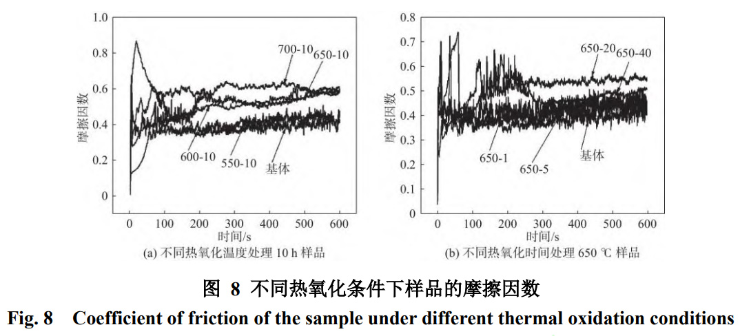 圖8為不同熱氧化條件下樣品的摩擦因數,可以發現未經處理的樣品的摩擦因數較低在0.4左右,而經過熱氧化后的樣品的摩擦因數與未經處理相比有著較為明顯的提高。并且結合氧化樣品的硬度可以發現,氧化樣品的硬度越高,它的摩擦因數也越高。由于氧化樣品的粗糙度高于未經處理的樣品,且隨著摩擦時間的增加,氧化層遭到破壞,硬化表面的磨損碎屑充當第三體進入到摩擦中,TiO2顆粒的硬度遠大于基體本身的硬度。所以TiO2顆粒當進入摩擦中時粗糙度大大增加從而導致摩擦因數增加。