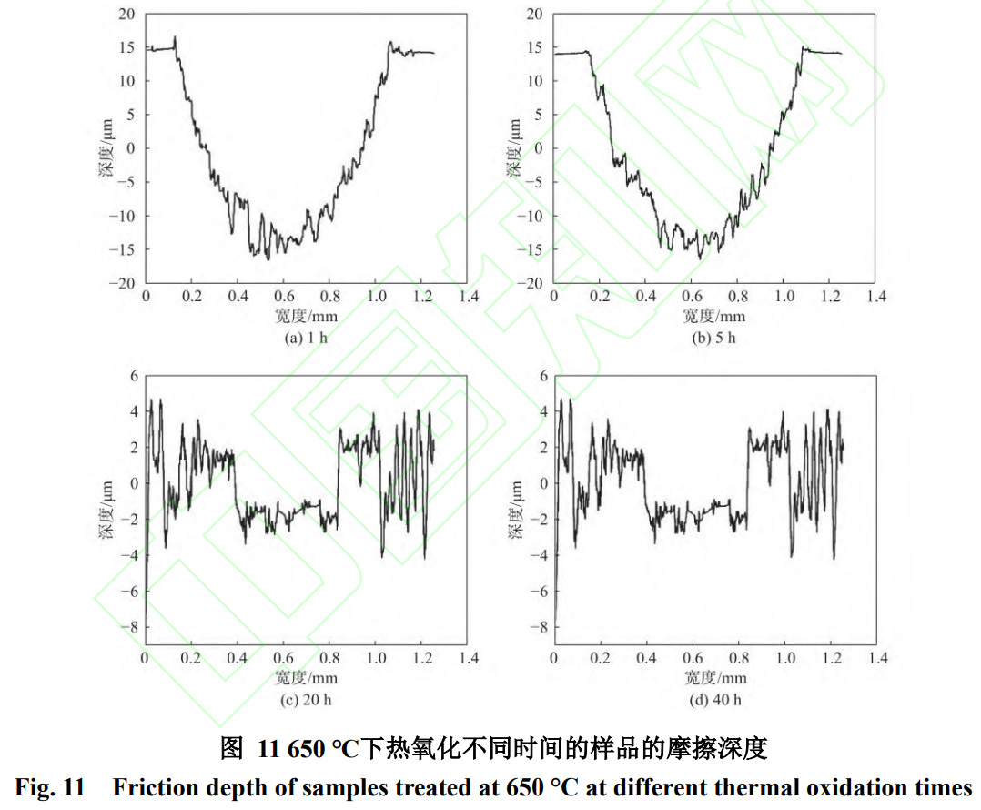 650℃熱氧化不同時間的樣品的摩擦深度如圖11所示。從圖11中可以發現,熱氧化1h和5h時樣品的摩擦深度都在15μm左右,與未經熱氧化的樣品的深度(圖9a)相差不大。這是由于在這兩個條件下樣品的厚度較薄,氧化顆粒還未完全覆蓋樣品表面,此時的氧化層硬度較小,無法支撐住氧化層接受劇烈的摩擦。在經過循環摩擦后,氧化膜完全破裂,摩擦球直接與基體接觸進行摩擦。所以這兩種條件下樣品的摩擦深度較深。隨著熱氧化時間的增加,樣品的摩擦深度在變淺。在熱氧化10h時的樣品的摩擦深度最淺,僅為0.35µm(圖9d),熱氧化20h和40h時的平均摩擦深度為2.052~2.55µm,均大于10h時的。綜合來說,隨著熱氧化時間的延長,樣品的摩擦深度由深到淺再變深。而從圖12中也可以看出,熱氧化1h和5h時,樣品的磨痕形貌與未經熱氧化的樣品有相似的寬而大的溝槽,表現出嚴重的磨粒磨損和黏著磨損。熱氧化20h和40h時的樣品表面的氧化層在摩擦過程中脫落,露出內層的氧化層。這由于20h和40h的熱氧化樣品的氧化膜由多層組成,但是層與層之間的結合狀態很差。干滑動會導致氧化層接觸區域產生局部應力,因此,黏合不良的氧化層將被分離,并在粘附和磨粒磨損下脫落。