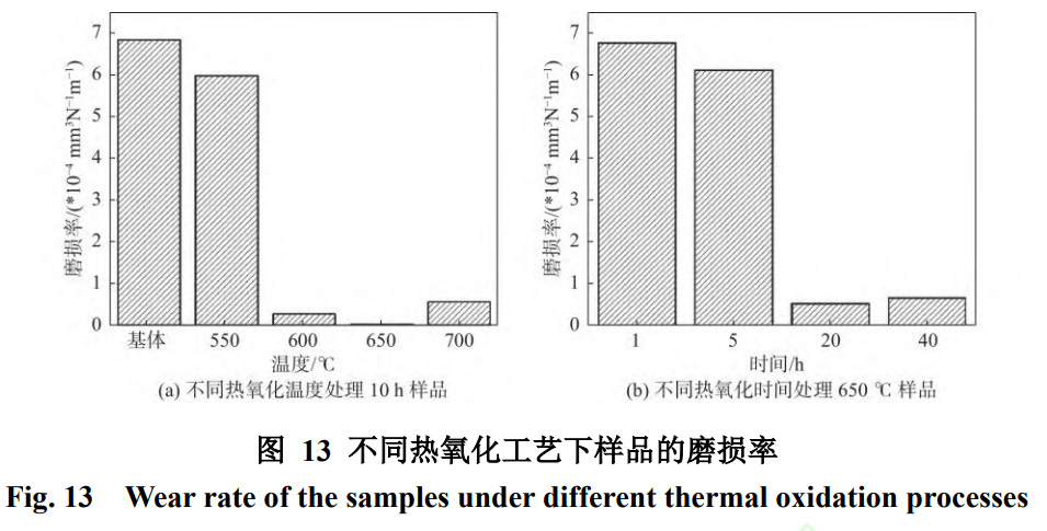 圖13(a)展示了不同溫度熱氧化條件下樣品的磨損率。可以觀察到基體的磨損率最高,熱氧化明顯降低了Ti6Al4V鈦合金的磨損率。對比不同溫度熱氧化的樣品,發現隨著溫度的升高,樣品的磨損率呈下降趨勢。然而,在溫度高于700℃后,樣品的磨損率有所上升,這與磨痕形貌的變化和氧化層的硬度變化規律相符。這是由于700℃時樣品氧化膜的結合狀態不佳導致的磨損體積增加。因此,可以得出結論,在不同熱氧化溫度處理的樣品中,650℃的耐磨性最好。而通過不同熱氧化時間條件下樣品的磨損率如圖13(b)可以發現,與未經處理的Ti6Al4V鈦合金相比,經過不同熱氧化時間處理下的磨損率明顯降低。不同熱氧化時間的樣品相比,在650℃/(1~10)h熱氧化樣品的磨損率呈下降趨勢,在10h時達到最低。當時間增加到20h后,氧化樣品的磨損率呈增長趨勢。這是因為氧化時間增加,氧化樣品的涂層變厚,但涂層中氧化顆粒之間的空隙變大,涂層變得疏松,在摩擦過程中,被磨下來的摩擦體積增大。所以20h后氧化樣品的磨損率增加。因此在不同熱氧化時間條件下,10h的耐磨性最好。