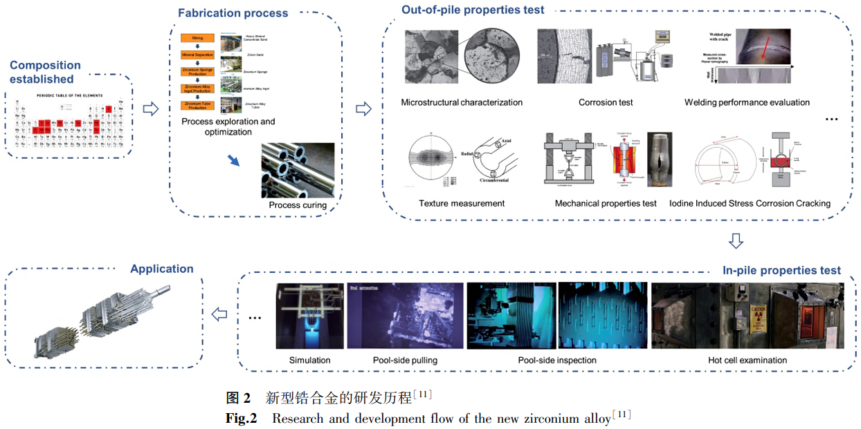 德國化學家馬丁.海因里希.克拉普羅斯于1789年首次發現了鋯元素。1824年,瑞典化學家喬斯.雅各布.布雷澤利烏斯通過在鐵管中混合加熱鉀和氟化鋯,在實驗室中分離出這種金屬。直到1925年,荷蘭化學家A.E.vanArkel和J.H.deBoer才發明了一種碘化物工藝來熱分解四碘化鋯,并生產出更純的金屬鋯。這種韌性金屬被稱為碘化金屬或晶體棒,具有良好的延展性,可以冷加工。當時,大多數生產的金屬用于電子工業的吸氣和真空管部件,但工藝昂貴,供應有限。到1948年,只有幾噸被用于工業生產中。20世紀40年代末,美國率先研究了鋯在水冷反應堆中的應用,之后俄羅斯、法國、德國等國自20世紀50年代起先后研發出一系列鋯合金。1951年,美國科研人員通過利用Sn元素吸收鋯合金中的有害元素,研發出了Zr-2.5Sn合金,即Zr-1合金,然后調整元素組成研制出具有優良綜合性能的Zr-2合金,并用作世界第一艘核潛艇的核燃料包殼材料,后來又加以改進研制出Zr-4合金,一直沿用至今[4]。為了解決Sn元素含量較高導致鋯合金耐腐蝕能力無法進一步提高的問題,隨著冶煉技術的提高,人們通過控制Sn元素含量并提高其中的鐵和鉻的含量對Zr-4合金進行了改進。此外,Zr-Nb系合金也得到了世界各國的關注,如加拿大開發了Zr-2.5Nb合金[5],前蘇聯研制了E110等系列鋯鎳合金[6]。近年來,隨著工業化的發展和技術水平的提高,各種高性能新型鋯合金也不斷被研發出來,如美國的Zirlo合金[7]、日本的抗腐蝕新合金(NDA)[8]、前蘇聯的E635合金[9]、法國的M5合金[10]等。新型鋯合金的研發歷程如圖2所示[11]。