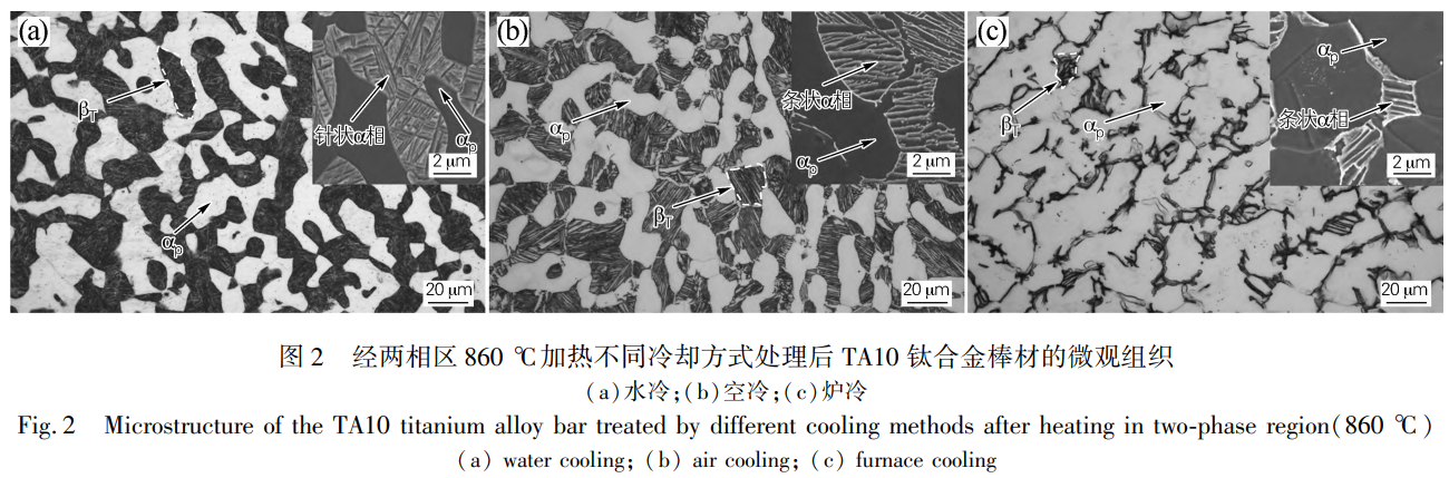 1)當加熱溫度為兩相區860℃時,TA10鈦合金經水冷與空冷處理會形成雙態組織,β轉變組織中析出形貌細小的α相,經爐冷處理會形成等軸組織,析出α相尺寸增加。當加熱溫度為單相區900℃時,合金經水冷與空冷處理會形成細片層β轉變組織,且出現粗大β晶粒,經爐冷處理會形成粗片層β轉變組織,晶界α相明顯粗化。