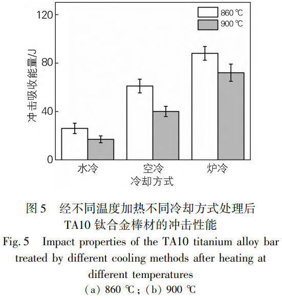 經不同冷卻方式處理后,TA10鈦合金的沖擊性能數值與變化趨勢如圖5所示。可以發現,無論加熱溫度為兩相區溫度860℃還是單相區溫度900℃,在3種不同冷卻方式下,合金的最佳加熱溫度均為兩相區溫度,且合金在水冷條件下的沖擊性能較差,而在爐冷條件下的沖擊性能最優異。對比發現,合金經兩相區溫度860℃加熱后再進行爐冷處理,合金沖擊性能達到最大值,此時合金的沖擊吸收能量為88J。