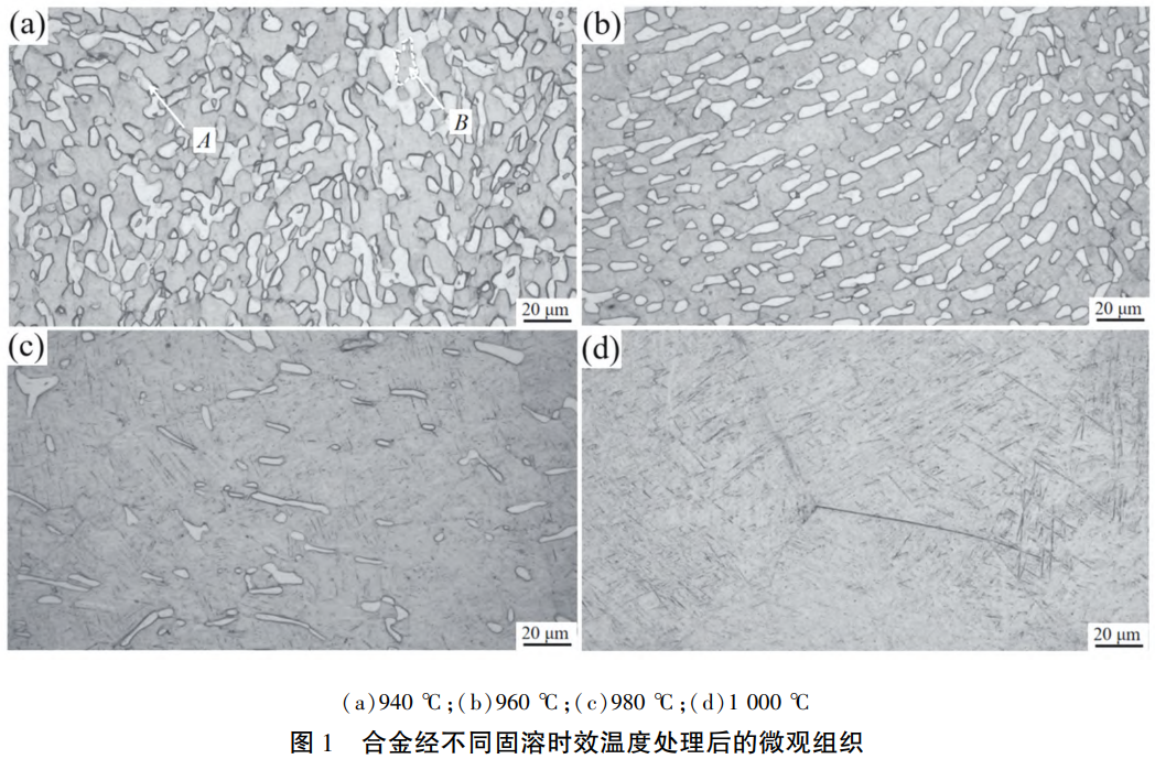 圖1為T(mén)C11鈦合金經(jīng)不同固溶時(shí)效溫度處理后的微觀組織形貌。在固溶溫度為940℃時(shí)(圖1(a)),合金的微觀組織類型為雙態(tài)組織,其主要由初生α相(位置A)以及β轉(zhuǎn)變組織(位置B)構(gòu)成,在β轉(zhuǎn)變組織內(nèi)部存在大量形貌細(xì)小的次生α相,而初生α相形貌以長(zhǎng)條狀為主,并伴有少量等軸狀形貌。在固溶溫度升高的過(guò)程中(圖1(b)(c)),發(fā)現(xiàn)組織形貌出現(xiàn)較為明顯的變化,其中初生α相體積與含量均不斷減少。當(dāng)固溶溫度升高至1000℃時(shí)(圖1(d)),發(fā)現(xiàn)初生α相完全消失,組織中出現(xiàn)粗大的β晶粒,且析出更多的次生α相,此時(shí)的組織類型轉(zhuǎn)變?yōu)榧?xì)片層β轉(zhuǎn)變組織。