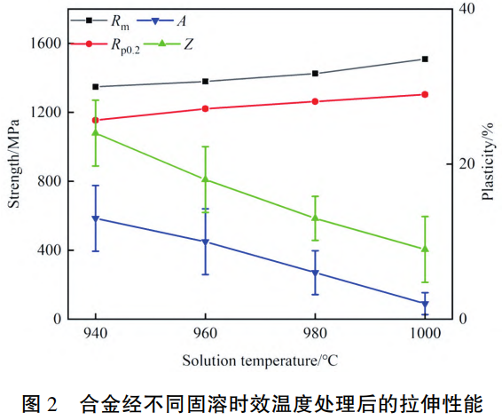 圖2為T(mén)C11鈦合金經(jīng)不同固溶時(shí)效溫度處理后的室溫拉伸性能。在時(shí)效溫度確定,固溶溫度改變的條件下,合金的強(qiáng)度隨固溶溫度升高而逐漸增加,其抗拉強(qiáng)度Rm由1348MPa升至1509MPa,屈服強(qiáng)度Rp0.2由1154MPa升至1304MPa,塑性則隨固溶溫度的升高而不斷減少,其斷后伸長(zhǎng)率A由13%降低2%,斷面收縮率Z由24%降至9%。由圖1可知,固溶溫度升高的過(guò)程中,組織中最明顯的變化為初生α相以及次生α相的體積與含量。
