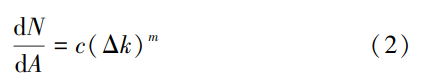 為單位循環(huán)內(nèi)裂紋擴(kuò)展速率;Δk為應(yīng)力強(qiáng)度因子范圍;c、m為與材料相關(guān)的常數(shù)。