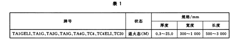 鈦合金板材的牌號、狀態及規格應符合表1的規定。